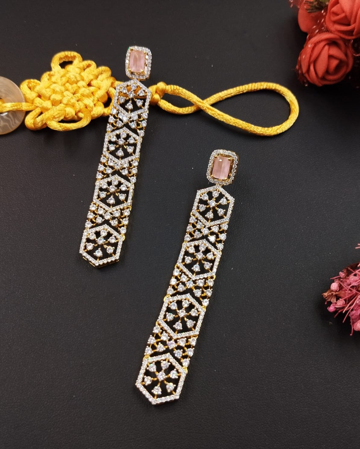 Enhance your elegance with these luxury geometric diamond drop earrings, designed with a refined long silhouette and intricate detailing. The earrings feature a soft light pink rectangular TOP stone (blush pink / rose quartz tone) at the stud, beautifully complemented by sparkling white American Diamond (CZ) NUG stones arranged in an elegant geometric pattern.
