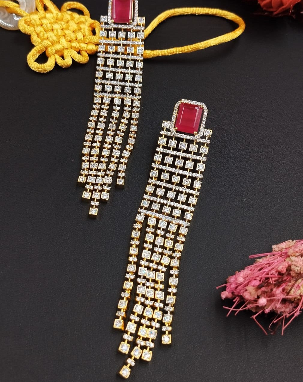 Shop red stone diamond-style long tassel earrings in premium gold finish. Perfect for weddings, festive wear, parties and special occasions.