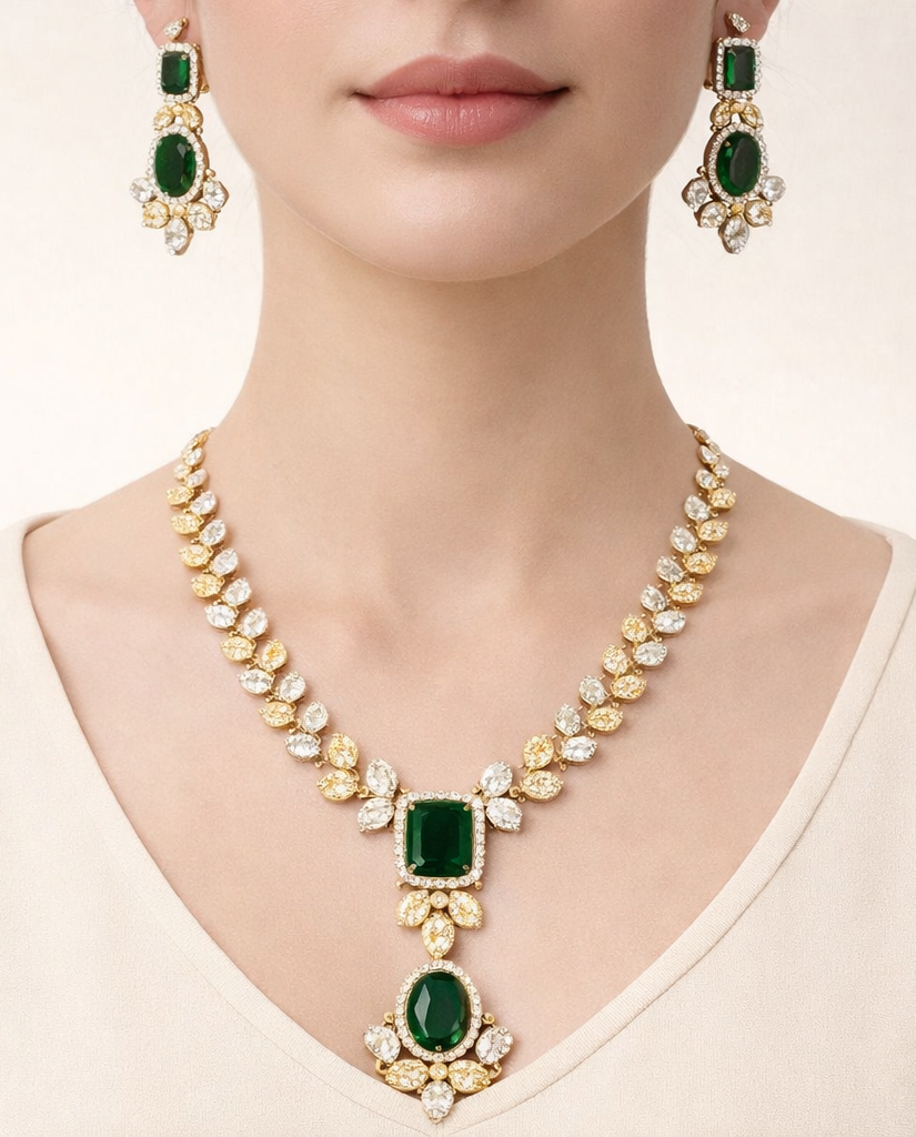 Elevate your occasion wear with this elegant gold polish American diamond necklace set, featuring a striking green centre stone in a refined designer layout. The necklace showcases a balanced pattern of white American diamonds with gold accents, finished with a beautifully crafted drop pendant. The matching earrings mirror the same green stone and detailing, making this set ideal for weddings, receptions, festive functions, and party wear.